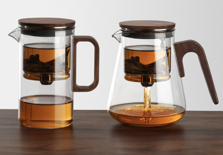 קנקן תה מודרני מזכוכית עם מכסה מגנטי ומנגנון ניקוז ייחודי המבטיח חליטה מהירה ונוחה.